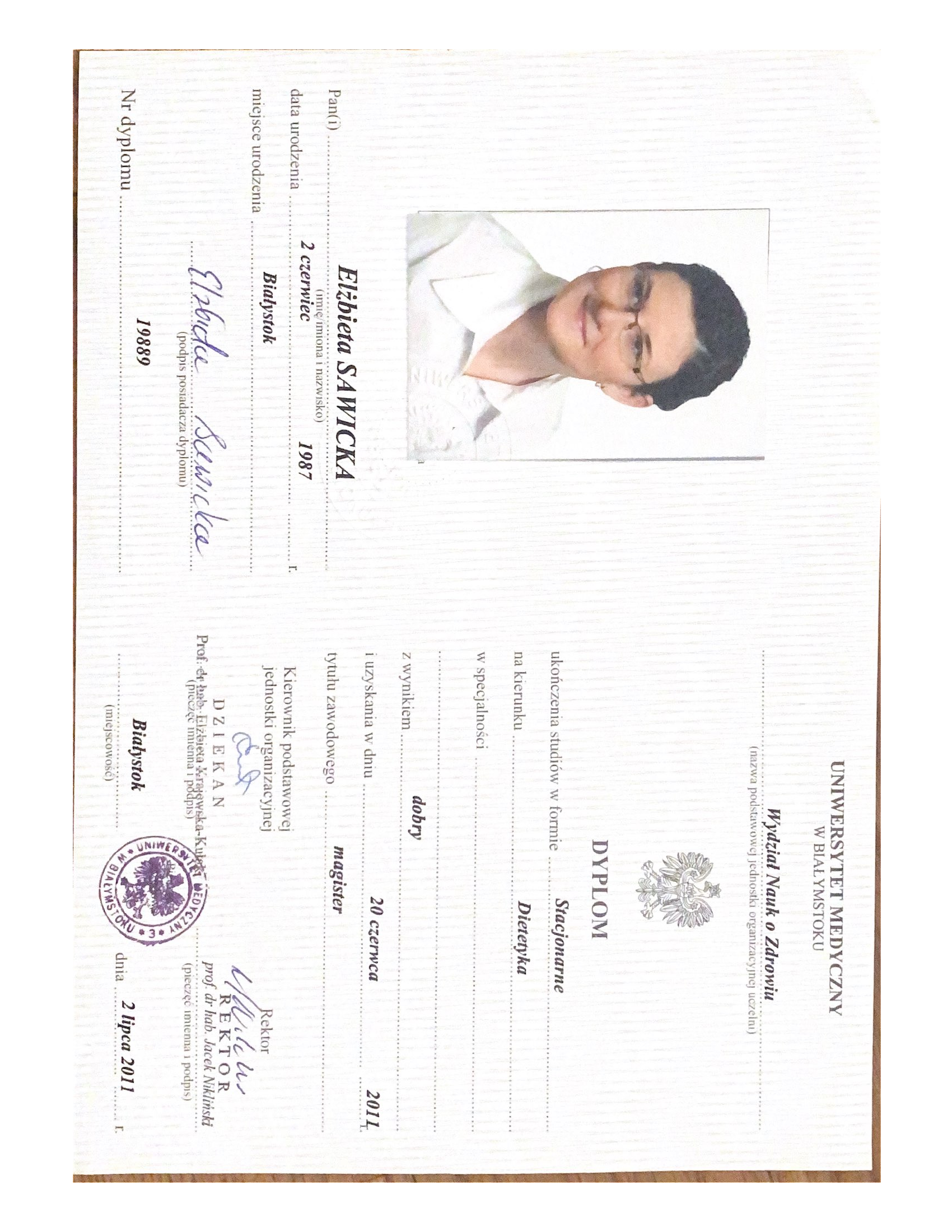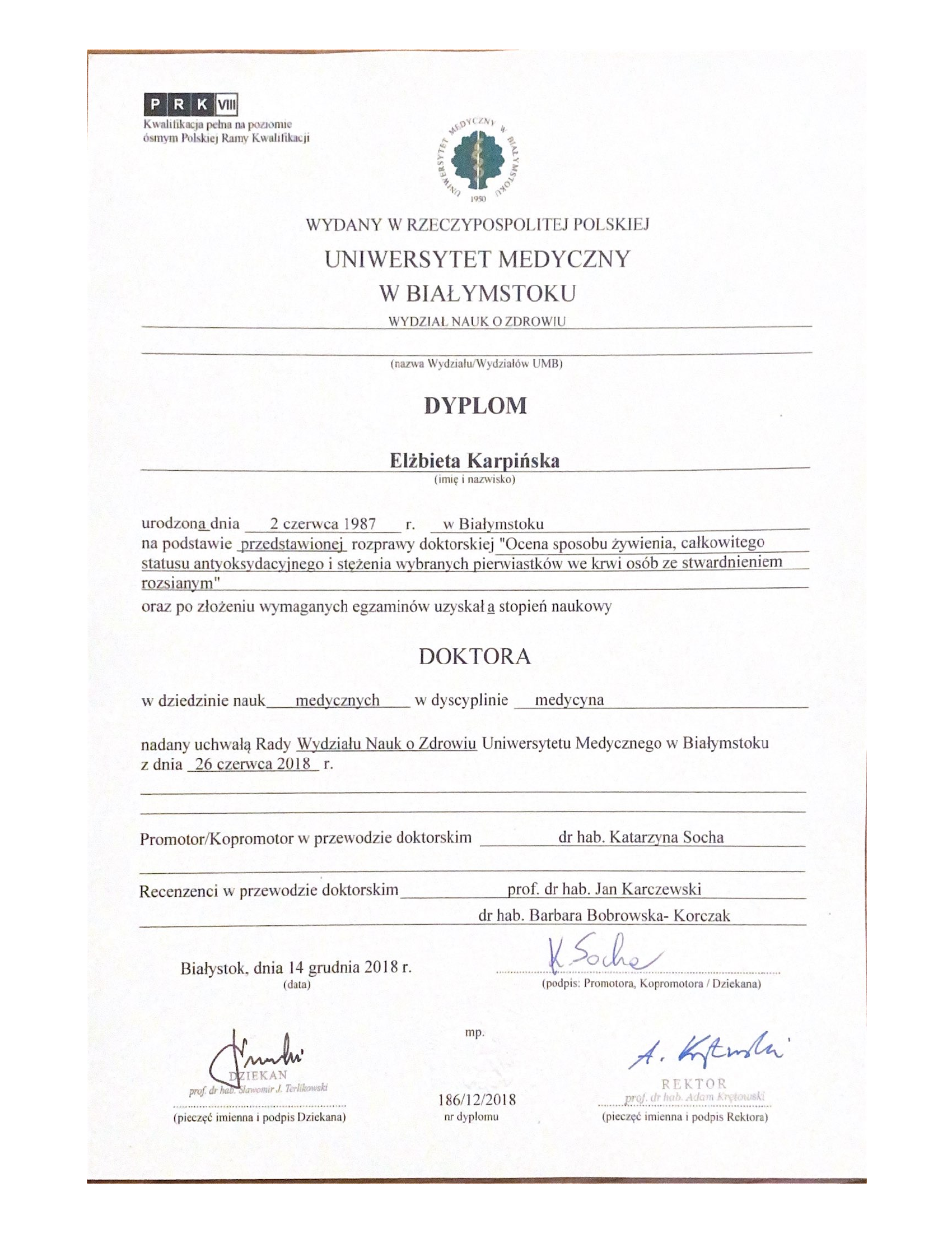dr n. med. Elżbieta Karpińska, magister dietetyki, absolwentka Uniwersytetu Medycznego w Białymstoku. Aktualnie: Dietetyk w TopMed s.j. Doświadczenie zawodowe: - dietetyk w Lekarskiej Specjalistycznej Spółdzielni Pracy „Eskulap” - dietetyk w Szpitalu Uzdrowiskowo-Rehabilitacyjnym - dietetyk w PS 36 w Białymstoku W gabinecie prowadzone jest poradnictwo i terapie żywieniowe, zarówno w chorobach metabolicznych (otyłość, cukrzyca, nadciśnienie, zaburzenia lipidowe) jak i w chorobach...